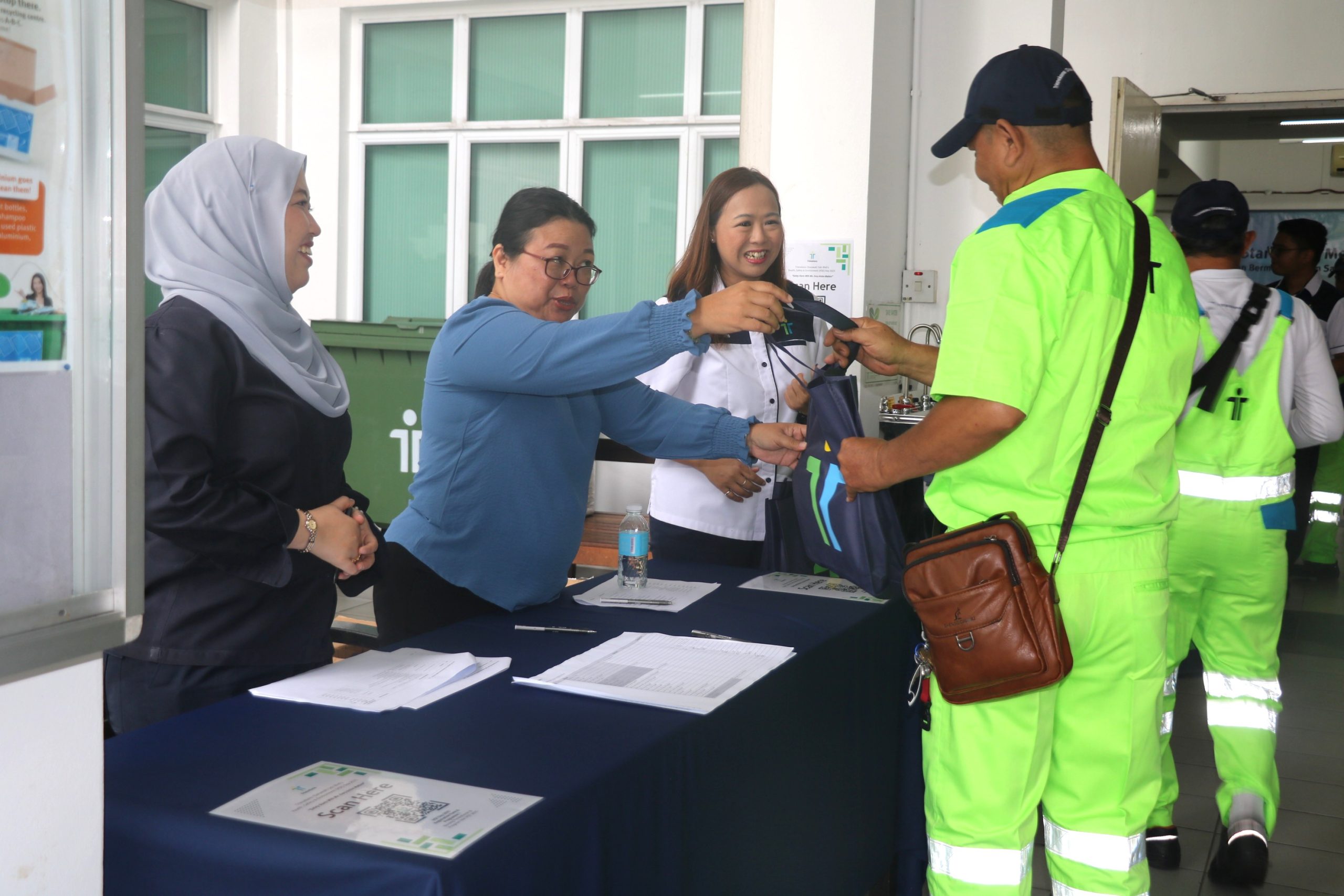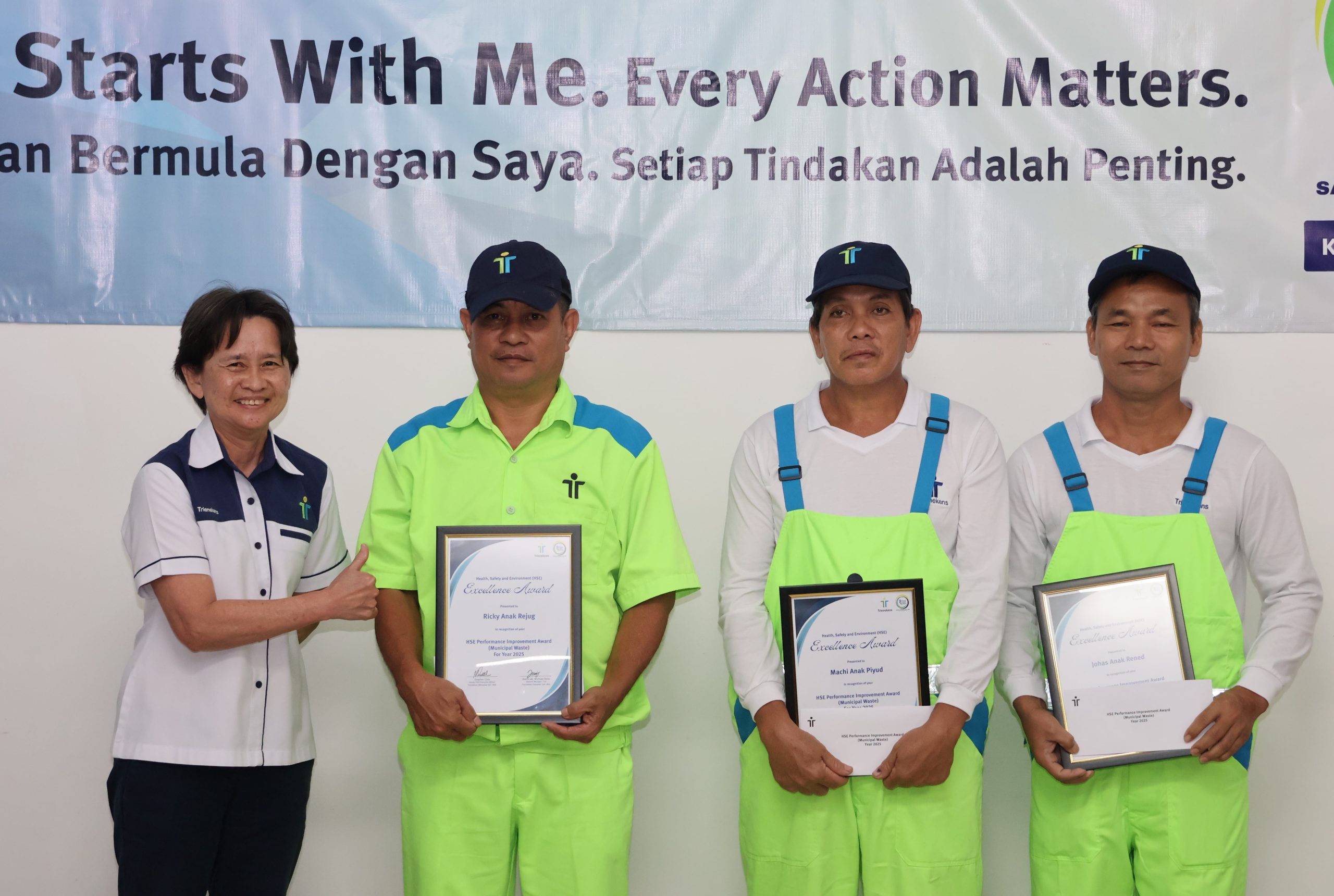 Alice presenting the HSE Performance Improvement Award 2025 to Municipal Waste Service Team (left to right) – Samti ak Tomi, Syed Sazali bin Wan Idrus and Adi bin Abdul Khaliq.
