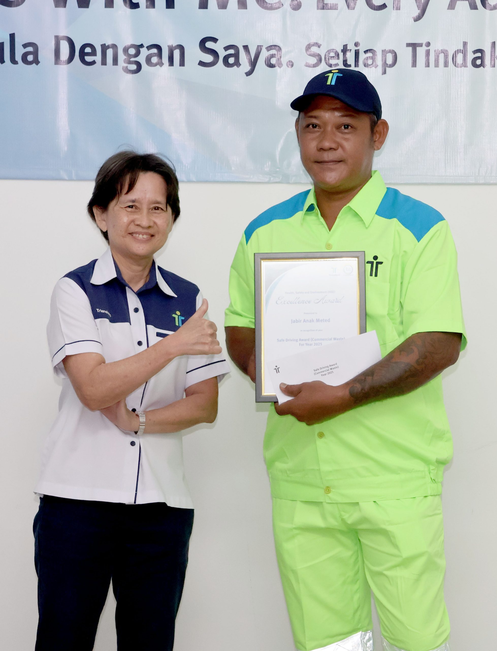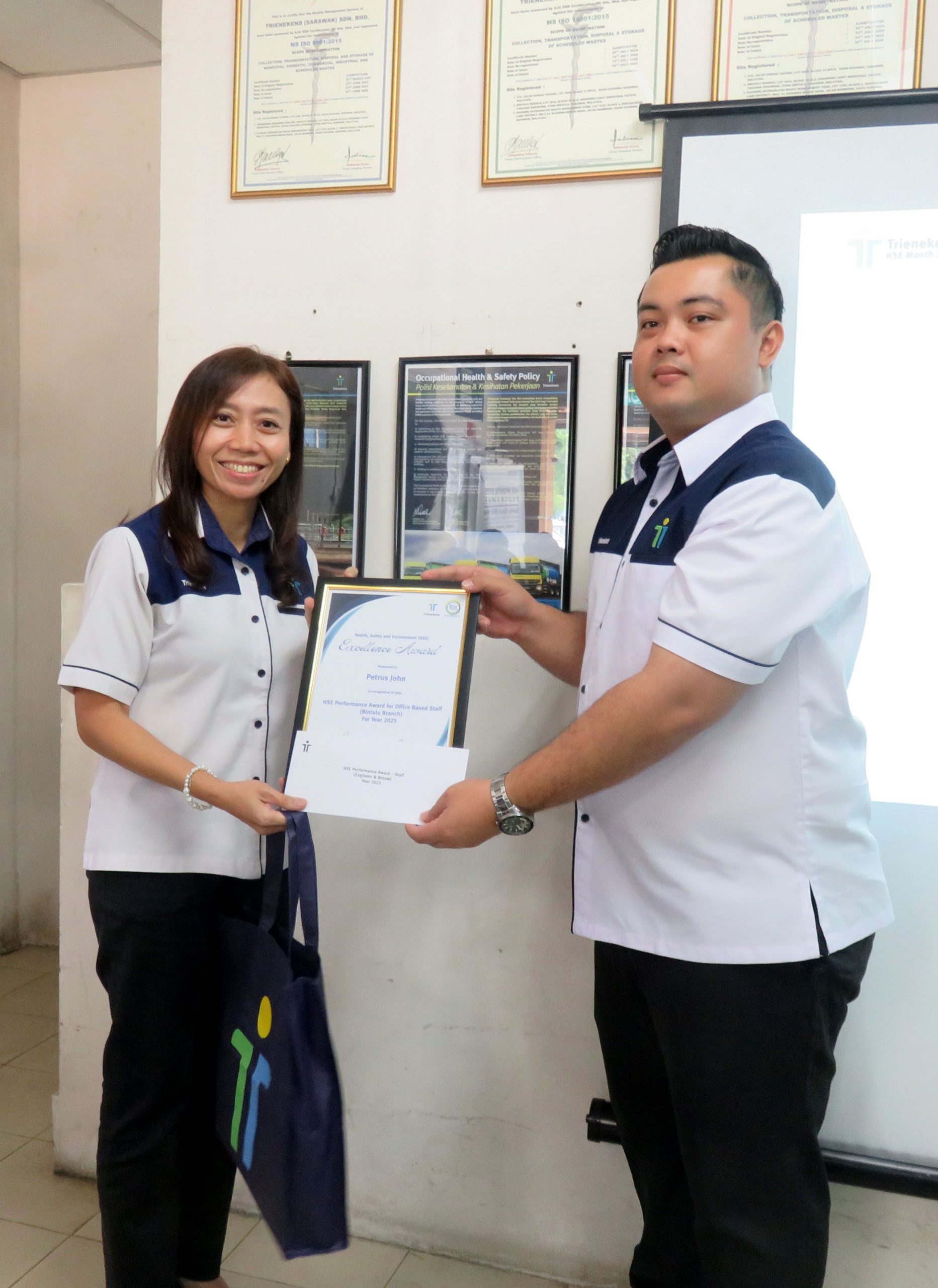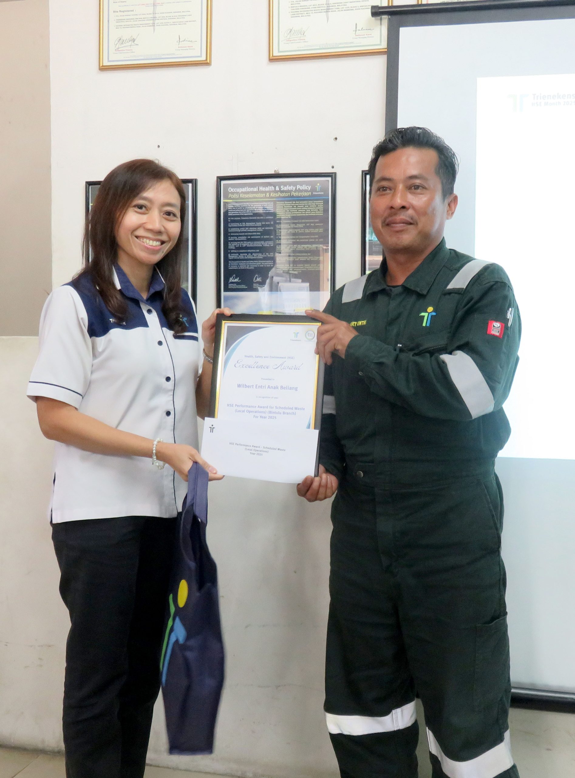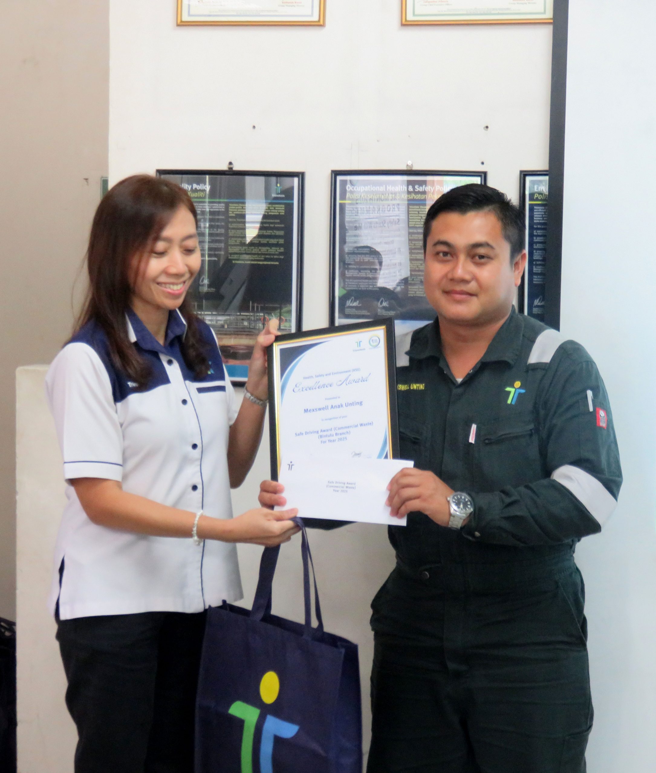Trienekens Senior Manager for Bintulu Branch, Patricia Susie Nyisong presenting the HSE Excellence Award for Safe Driving – Commercial Waste (Bintulu Branch) to Mexswell ak Unting.