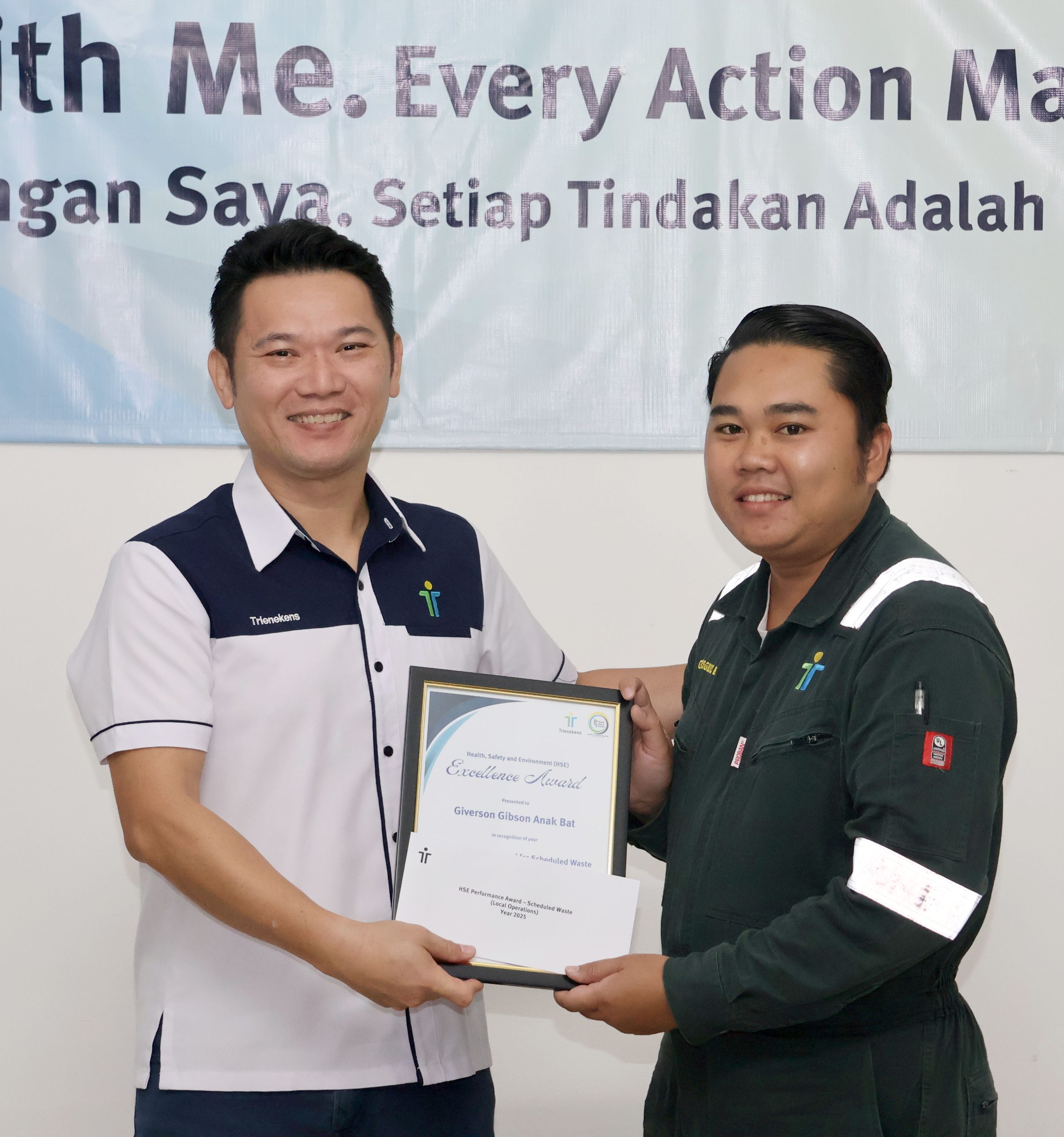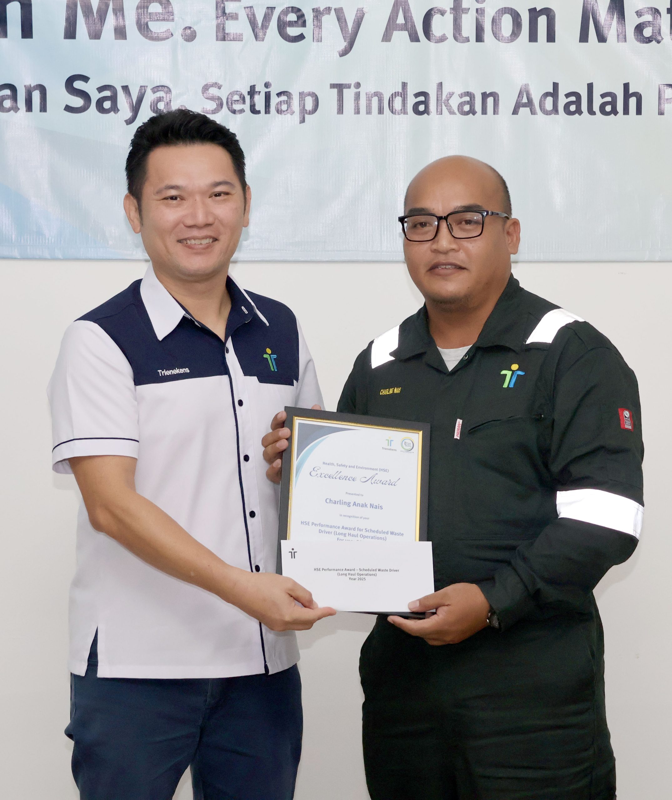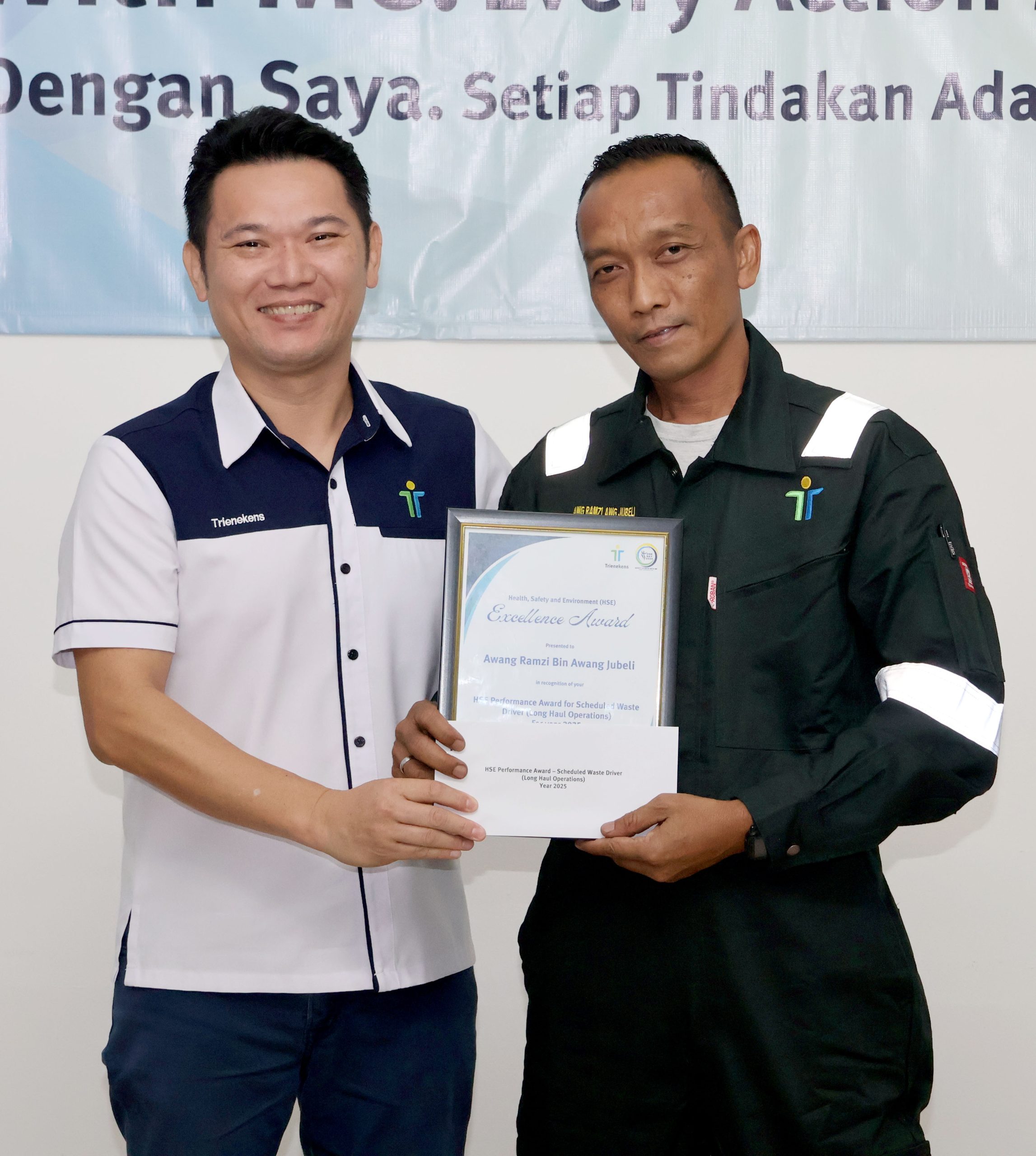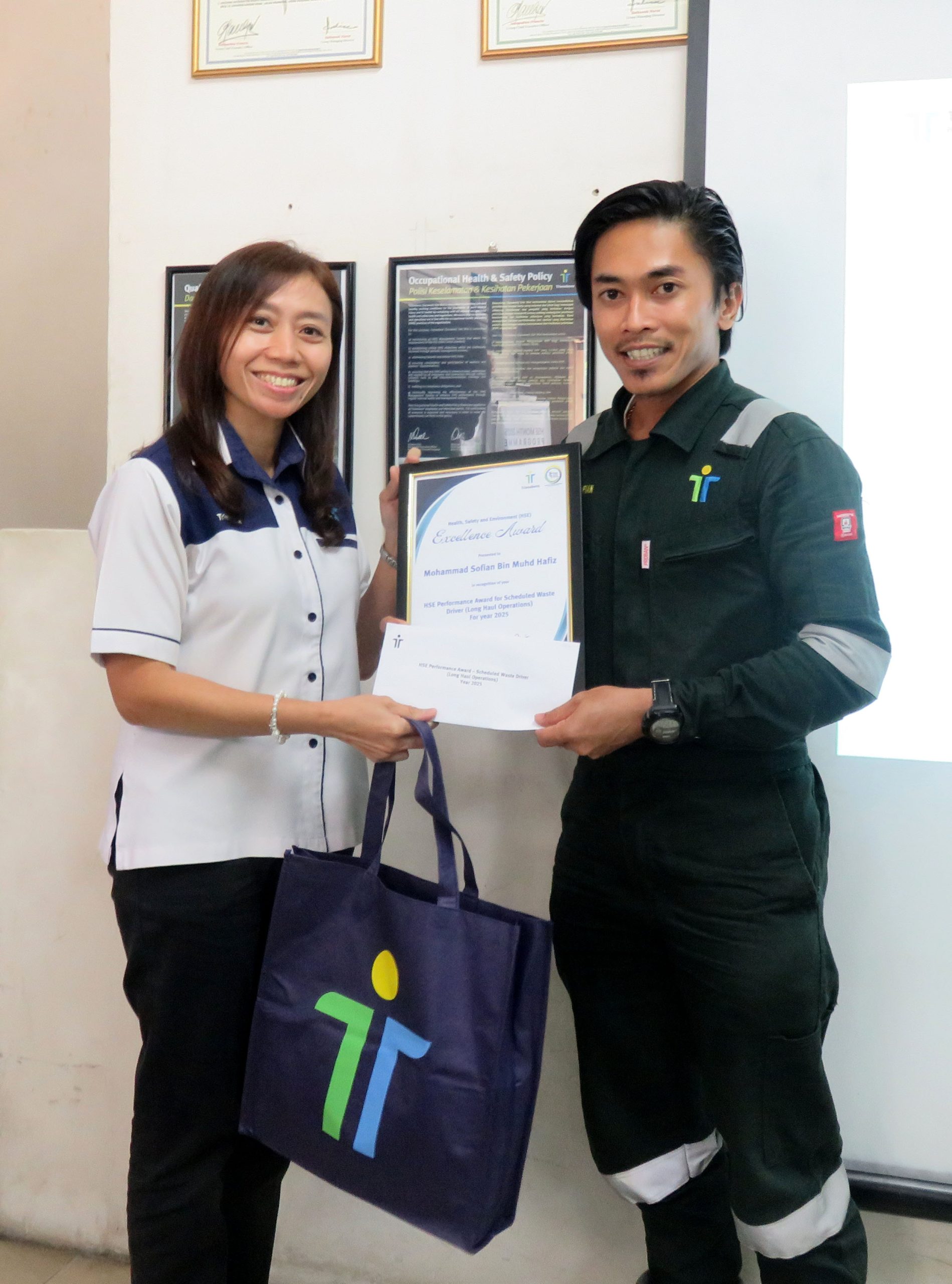 Elvin presenting the HSE Performance Award – Scheduled Waste Driver (Long Haul Operations) to Awang Ramzi bin Awang Jubeli.