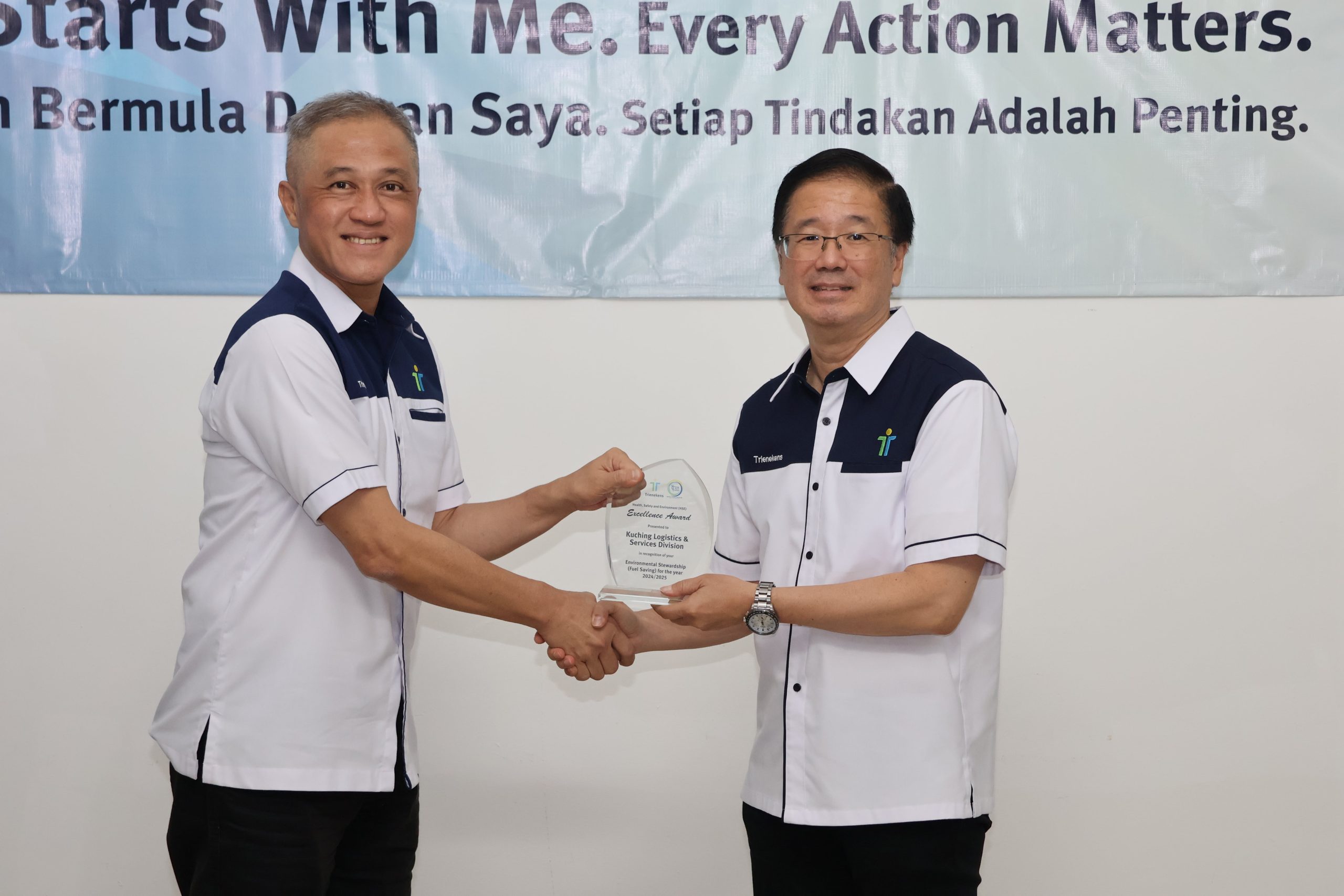 Kuching Logistics and Services Division was accorded the HSE Excellence Award for Environmental Stewardship (Fuel Saving) 2024/2025. KLG Division Manager, Lee Ghee Seng is receiving the award from Stephen.