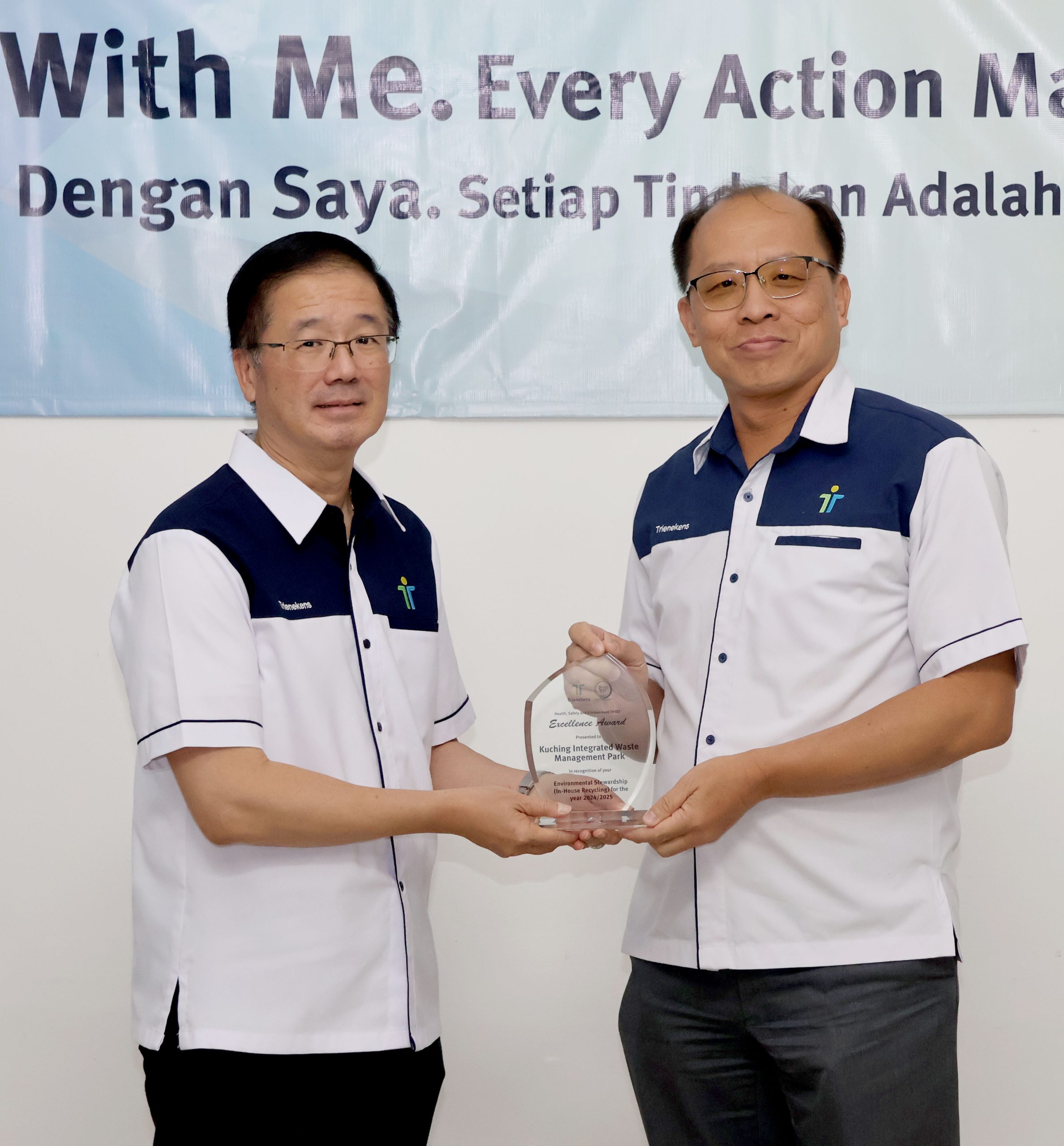 Kuching Integrated Waste Management Park (KIWMP) was accorded the HSE Excellence Award for Environmental Stewardship (In-House Recycling) 2024/2025. General Manager for Treatment & Disposal, Simon Chow is receiving the award from Stephen.