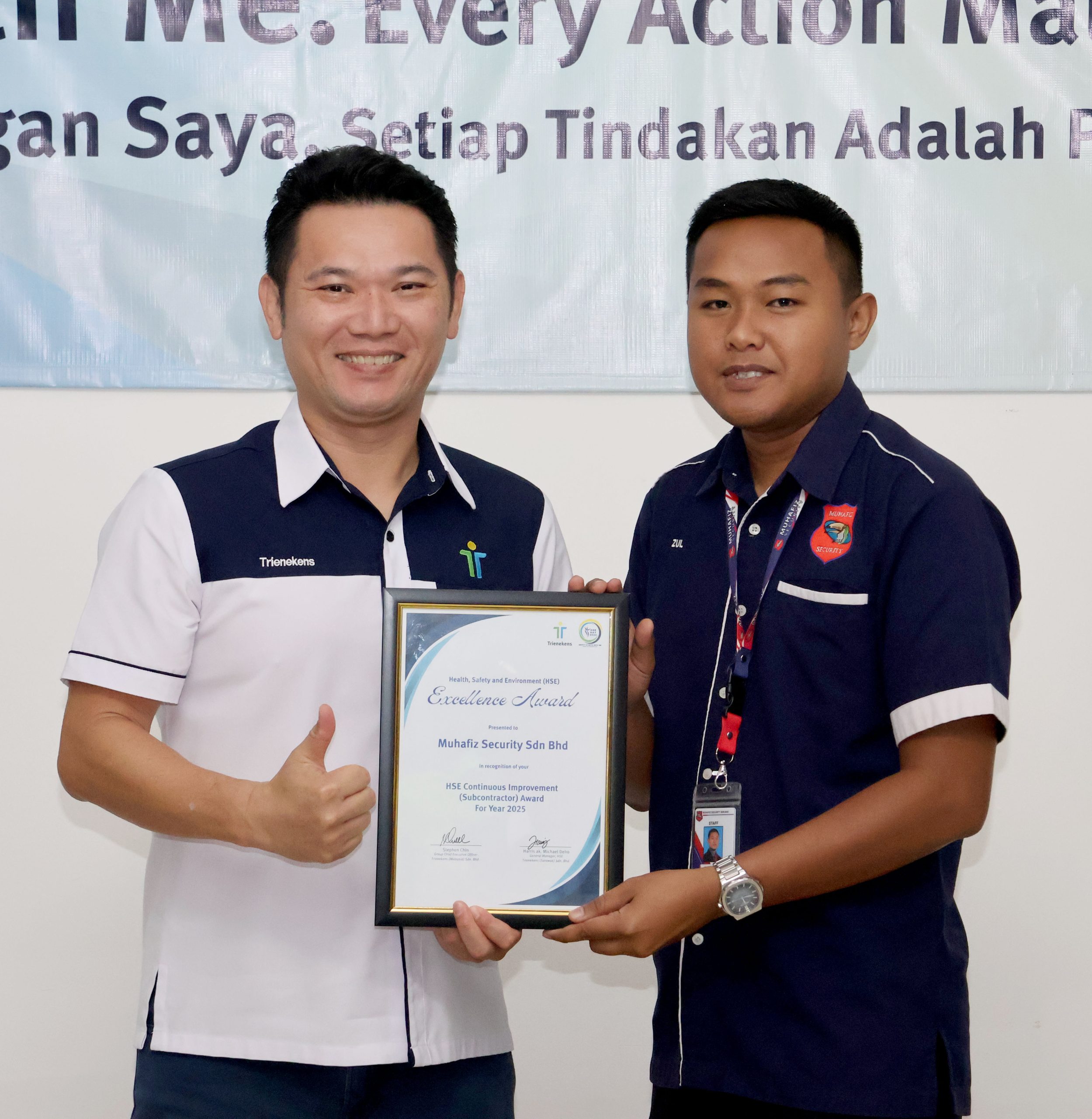 Trienekens Deputy Group CEO, Elvin Wee, presenting the HSE Continuous Improvement Award (Sub Contractor) to a representative from Muhafiz Security Sdn Bhd.