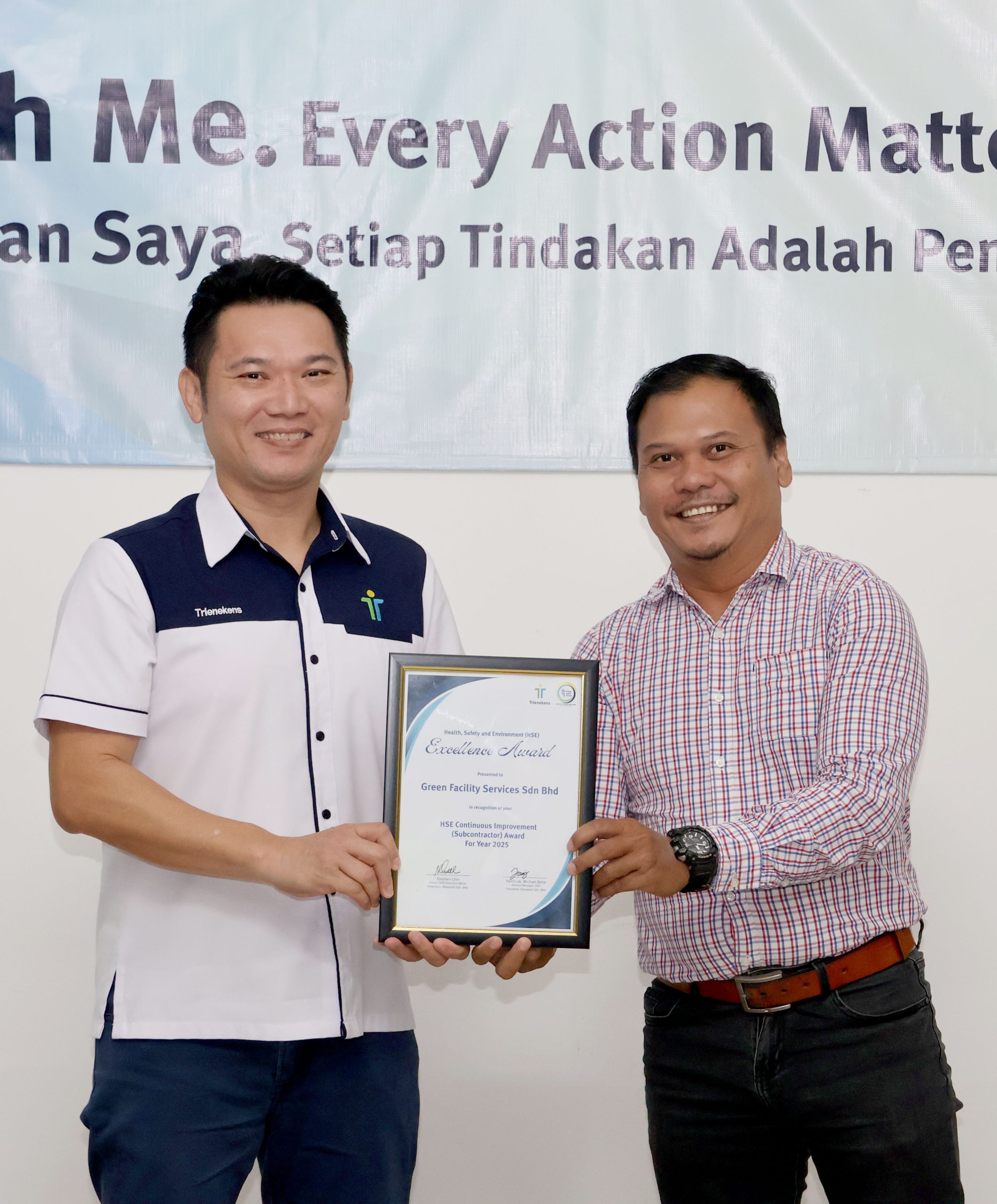 Elvin presenting the HSE Continuous Improvement Award (Sub Contractor) to a representative from Green Facility Services Sdn Bhd.