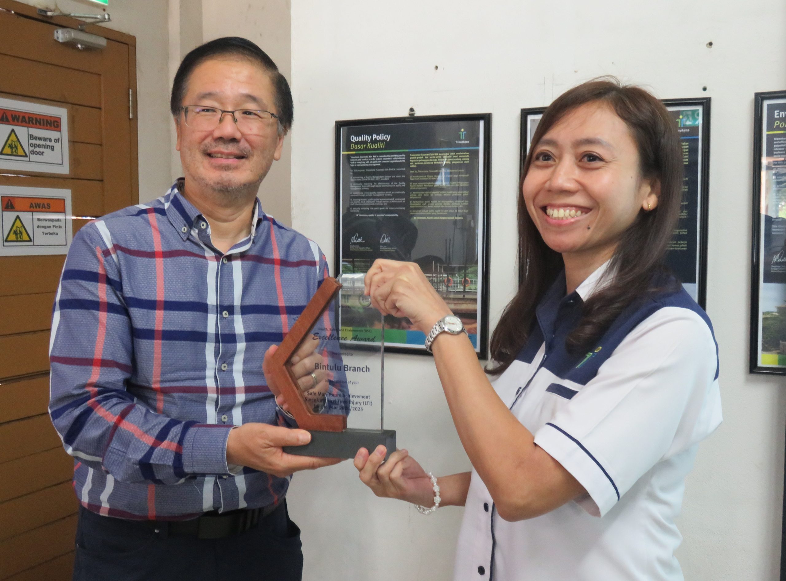 Patricia presenting the HSE Performance Award for Office Based Staff (Bintulu Branch) 2025 to Petrus John.